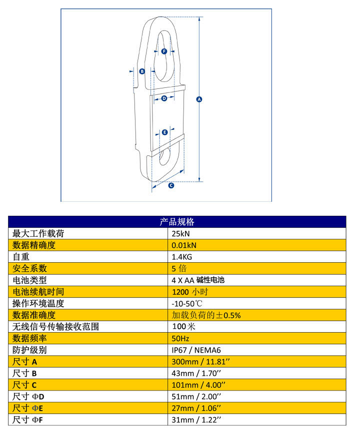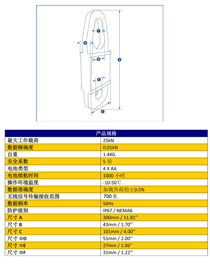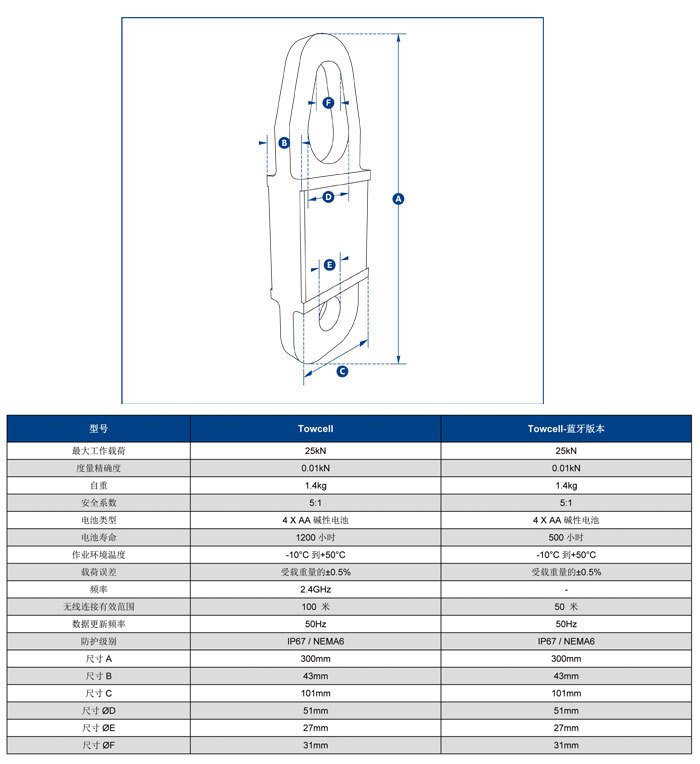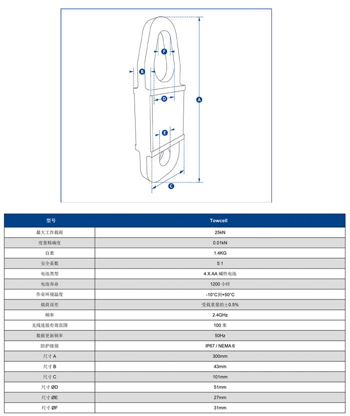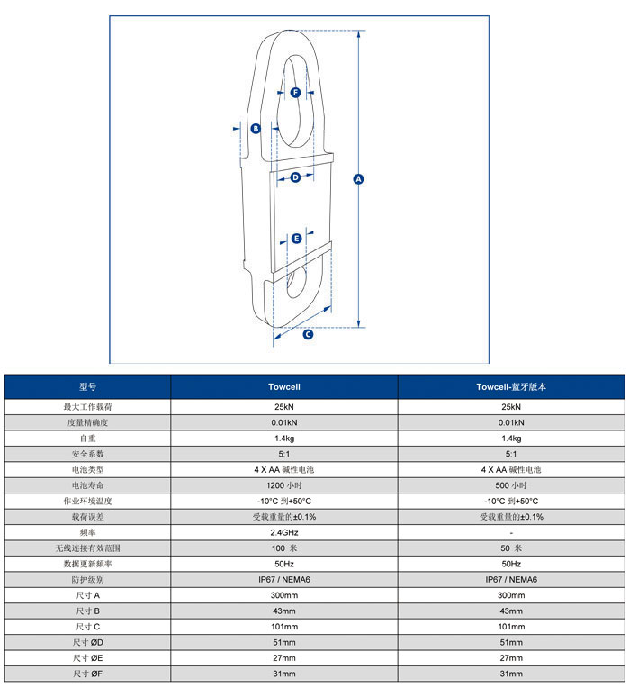 此產品的最大工作載荷為25kN(相當于牽引質量2.5噸),主體由航空用鋁合金材質構成,使其自重保持在更低的水平,更大程度方便使用者安裝操作和搬運移動。其內部核心構造現在采用了獨立式的密封防護構造,使其防護等級達到IP67/NEMA6防水環境保護的要求,即便使用中電池封蓋丟失,設備仍可以繼續正常工作。利用兩節普通的堿性電池,設備續航能力便可達到1200小時。