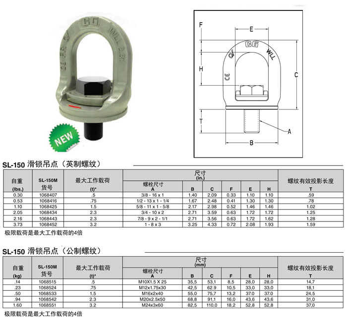 1. 相較于各種尺寸的普通環(huán)眼螺栓吊點,SL-150滑鎖吊點的環(huán)眼結(jié)構(gòu)更大,可幫助輕松完成結(jié)索。