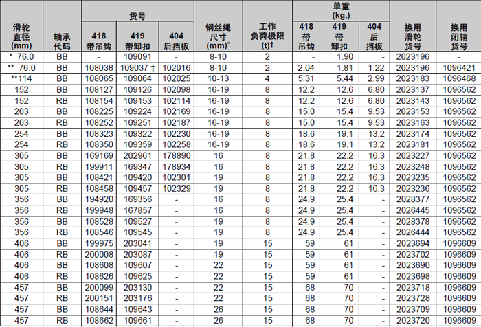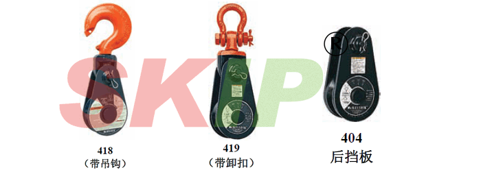 注意:訂購(gòu)時(shí)請(qǐng)指明:大小、滑車(chē)編號(hào)、吊鉤或卸扣、青銅軸襯或滾子軸承以及鋼絲繩尺寸。