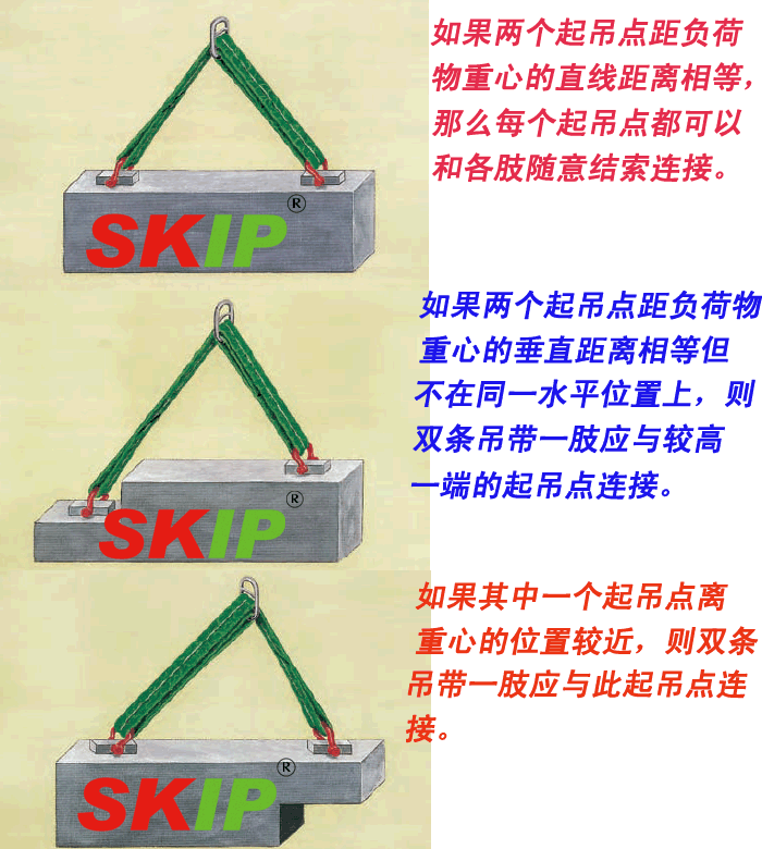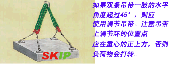 這是一種雙肢吊帶索具,其中一肢是另外一肢的2倍工作載荷。利用外力調節活動肢的長度可以使吊帶頂端的受力點處于負荷物的正上方,從而實現平穩起吊。為保證靈活使用,操作者必須按照正確方法使用可調節式雙肢吊帶索具。其中帶有雙條吊帶的一肢承擔較大比例的負荷重量,而單條吊帶的一肢只承擔較小比例的負荷重量。產品詳情: 請致電:13931305891, Email:info@skiplifting.com