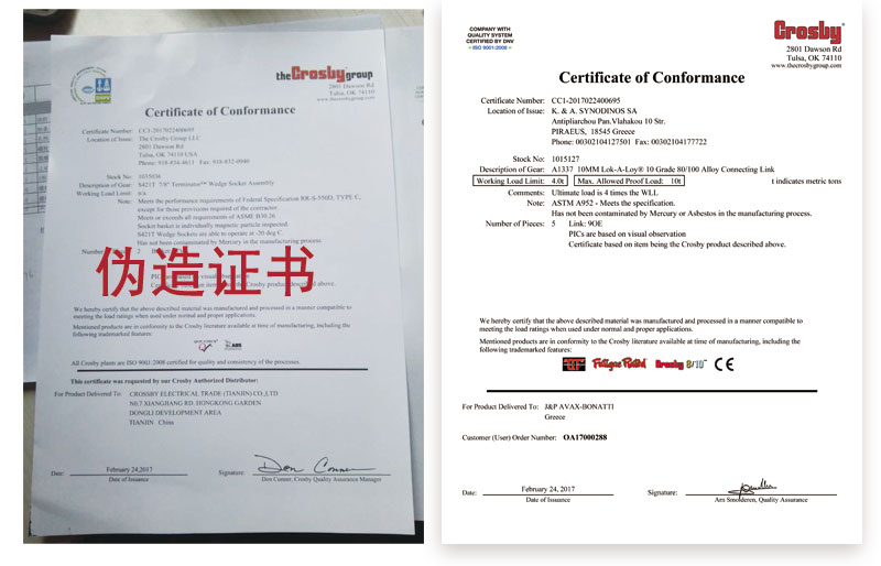Crosby最近收到市場反饋,天津科索比機(jī)電貿(mào)易公司提供偽造的Crosby產(chǎn)品證書,并以此銷售Crosby產(chǎn)品。