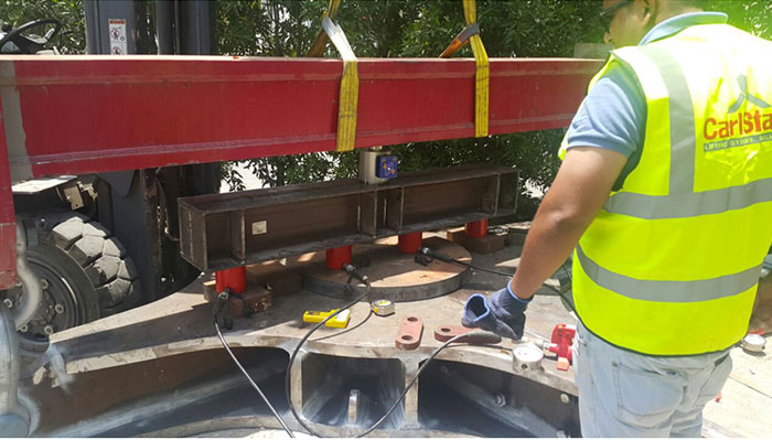 待測試的夾鉗被平放在地面上,其上放置著四臺荷載為50噸的液壓缸設備,沿橫梁方向一字排開。在此橫梁之上,擺放著一臺規格為150噸的速得智能壓力傳感單元,其上還有一套更大的吊梁(圖片中的紅色部分)設備與叉車連接。此大吊梁的左右兩端通過一個卸扣與夾鉗連接。