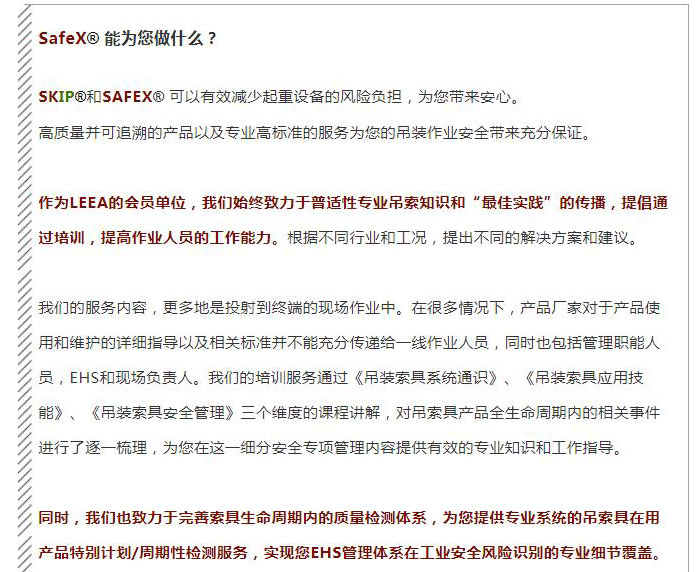 消除這種風(fēng)險的唯一方法是確保產(chǎn)品的安全性。這指采購?fù)耆线m用標(biāo)準(zhǔn)的產(chǎn)品。符合標(biāo)準(zhǔn)并不困難,也不需要高昂的成本,為了證明它們是符合的,起重設(shè)備必須有適當(dāng)?shù)臉?biāo)識和正確的文件。