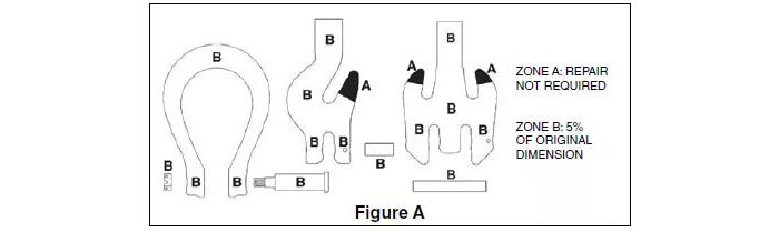 ● 停止使用:集成主環(huán)或配件如出現裂紋,缺口時,需要請專業(yè)人員對產品進行修理,專業(yè)人員必須沿鍛件輪廓進行垂直磨修,并保證尺寸的損耗不超過表 fig A 中規(guī)定的范圍,如超出此范圍,則產品不能再使用。