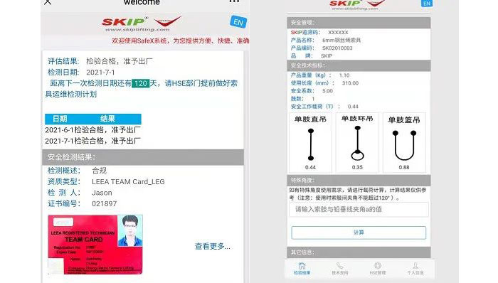 上圖為SAFEX系統(tǒng)主界面,我們看到他主要顯示了索具的評(píng)估結(jié)果、精確的過往檢驗(yàn)日期和下次檢驗(yàn)日期、索具的檢驗(yàn)人及資質(zhì)、索具的基本信息、安全技術(shù)指標(biāo)和一套非常實(shí)用的載荷計(jì)算小工具。這套系統(tǒng)界面中的信息能幫助使用者更好的了解產(chǎn)品的安全性能,在索具檢測時(shí)也能更完整清晰的記錄檢測信息,SAFEX為您的安全管理細(xì)節(jié)賦能!