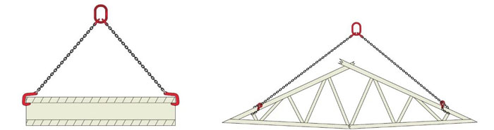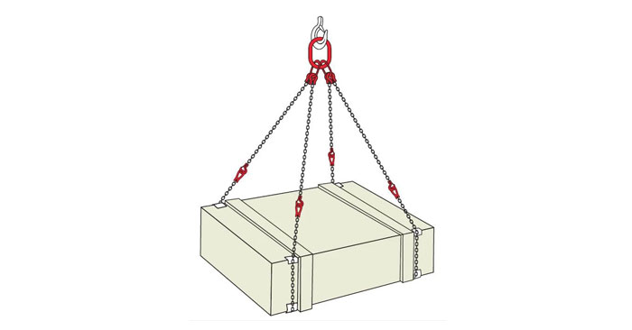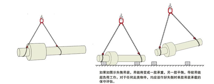 大件包裝箱,鋼板等可以使用雙肢花籃式吊裝搬運,但是使用四肢吊鏈與兩套速裝連接輔環套具配合更方便。所有的鏈條應該保持規格一致。
