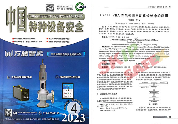在遠古時期,人類就學會了利用杠桿原理進行簡單的吊裝作業以滿足生活需要。后來隨著技術的進步,我們學會了使用更加精巧的結構借助自然之力(水力,風力等)進行生產。現代,我們已經可以通過科技的力量進行大規模建設,這是吊裝水平的提高,更是人類生產力的進步! 在未來,隨著對生產力要求的持續提升,越來越復雜的應用場景會對我們的工程師提出更多的難題,索具行業的發展正在迎來新的契機,我認為將會體現在以下幾個方面:解決問題需要先將問題分解再簡化整合。經過上百年的發展,對于索具產品的基礎功能分解已非常成熟,越來越多的供應商正在考慮將不同成熟的應用組合形式集成化,以簡化操作,使索具輕量化,對于這個問題,這是除了不斷突破材質性能極限外(同尺寸質量更。┑牧硪粭l可行途徑。索具的智能化進程在很久以前就已經開始,并將在未來不斷持續、深化下去。近年隨著各地基礎設施的建設,尤其是數據通訊產業升級,為遠程實時遙感監控帶來可能,配合不斷涌現的諸如負載動態監測、姿態控制設備等新產品和技術,相信智能化吊裝產品會越來越多地得到應用。吊索具的使用者除了得到產品本身,還能得到什么?這是一個值得研究的問題。對于吊索具這樣一個工業細分領域來說,使用者通過投入足夠多的內部管理時間和精力來控制隱性的生產安全成本是不現實的,這就需要外部的專項服務方案來解決問題,而這正是我們所專注的。SKIP和SAFEX可以有效減少起重設備的風險負擔,為您帶來安心,高質量并可追溯的產品以及專業高標準的服務為您的吊裝作業安全帶來充分保證。我們的服務內容,更多地是投射到終端的現場作業中。在很多情況下,產品廠家對于產品使用和維護的詳細指導以及相關標準并不能充分傳遞給一線作業人員,同時也包括管理職能人員,EHS和現場負責人。我們的培訓服務通過專業定制化的課程講解,對吊索具產品全生命周期內的相關事件進行了逐一梳理,為您在這一細分安全專項管理內容提供有效的專業知識和工作指導。同時,我們也致力于完善索具生命周期內的質量檢測體系,為您提供專業系統的吊索具在用產品特別計劃/周期性檢測服務,實現您EHS管理體系在工業安全風險識別的專業細節覆蓋。 我們一直在探索基于多樣性需求的吊索具產品應用組合設計自動化的解決方法并做出了一些有益的實踐。比如最近我司在《中國特種設備安全》上發表的一篇文章——《Excel VBA在吊索具自動化設計中的應用》中就較為具體地闡述了自動化理念在吊索具設計過程中的實踐應用。 文章主要研究了SKIP品牌產品基于Excel VBA 語言環境的算法建模和數據引用,通過標準化的變量輸入和邏輯條件判斷,對吊索具這一工業組合產品設計過程進行程序化重現,可以快速、有效完成在吊索具標準結構專業化設計,產品選型,長度和負載校核及制圖等方面的設計構建工作。快速響應了客戶需求技術化描述,提高了技術交流的工業化專業服務效率。通過Excel VBA 環境對設計過程標準化、程序化、規范化,可以有效輔助一般常規吊索具的設計工作,提高工作效率,校驗設計結果,對于小批量,定制化的吊索具自動化設計工具的進一步開發,提高工業行業供需交流的規范化程度具有參考意義。