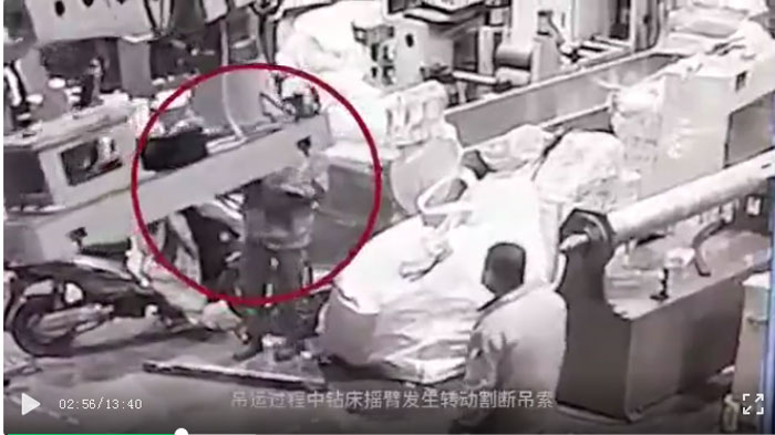 圖片事故案例發(fā)生于2020年,吊運過程中鉆床搖臂發(fā)生轉動割斷吊索,致使紅圈中錢某當場被砸死。