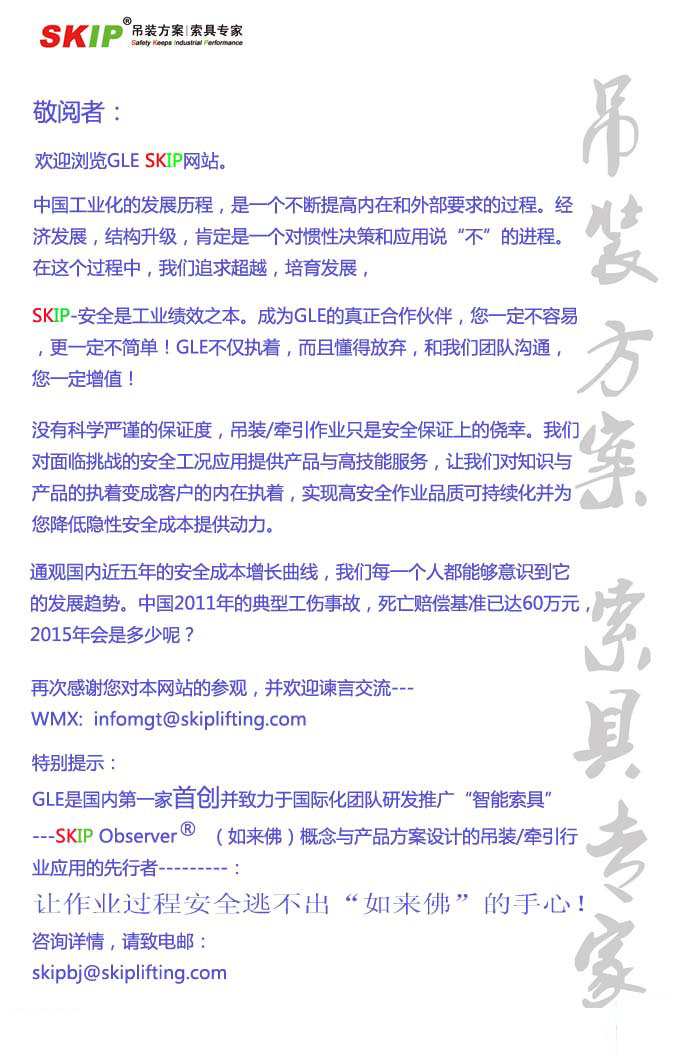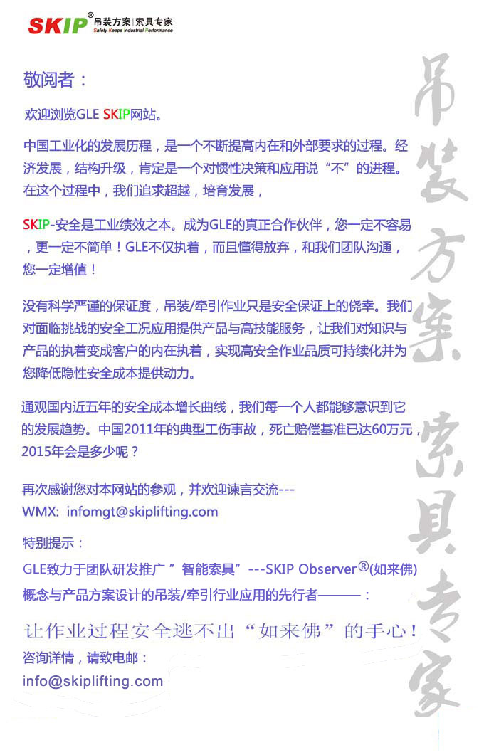 鄭重聲明:m.cnvvoqmb.cn為我公司合法合規(guī)官方網(wǎng)站。 GLE為美國(guó)CROSBY及英國(guó)Straightpoint在中國(guó)大陸合作伙伴, 進(jìn)口Kuplex8+10品牌索具系列輔件產(chǎn)品國(guó)內(nèi)供貨商!假冒偽劣者請(qǐng)注意國(guó)外制造商可能發(fā)起的知識(shí)產(chǎn)權(quán)法律訴訟風(fēng)險(xiǎn)。 凡屬利用我公司SKIP品牌提供相關(guān)產(chǎn)品與服務(wù)業(yè)務(wù),請(qǐng)及時(shí)與我司進(jìn)行真實(shí)性驗(yàn)證。驗(yàn)證郵箱:郵箱:info@skiplifting.com